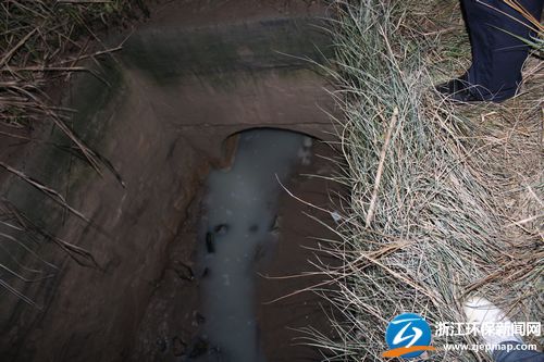 在投訴人指引下,記者在北侖江南電鍍園區(qū)西側(cè)河道內(nèi)找到了“偷排口”。