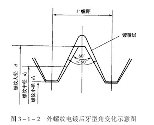 帶有普通螺紋的零件和緊固件,常遇到鍍覆后發生配合障礙的問題。當螺紋進行電鍍時,螺紋的牙尖部位和谷底部位的鍍層厚度是不一樣的,牙尖部位的鍍層厚度將明顯的大于谷底部位,隨著鍍層厚度的增加,它們之間的差異會越來越大,因此,螺紋的牙型角度變小,如圖所示。隨著螺紋直徑和螺距的不同,雖然牙尖和谷底部位鍍層厚度差異的比值也不同,但是隨著鍍層厚度增加,牙型角角度變小的傾向是始終如此的。螺紋直徑和螺距大一些,精度低一些,螺紋鍍后配合障礙就少一些,反之則多。實踐證明,螺紋電鍍后出現配合障礙的主要原因是牙型角鍍后的變形,其次才是鍍層厚度因素。